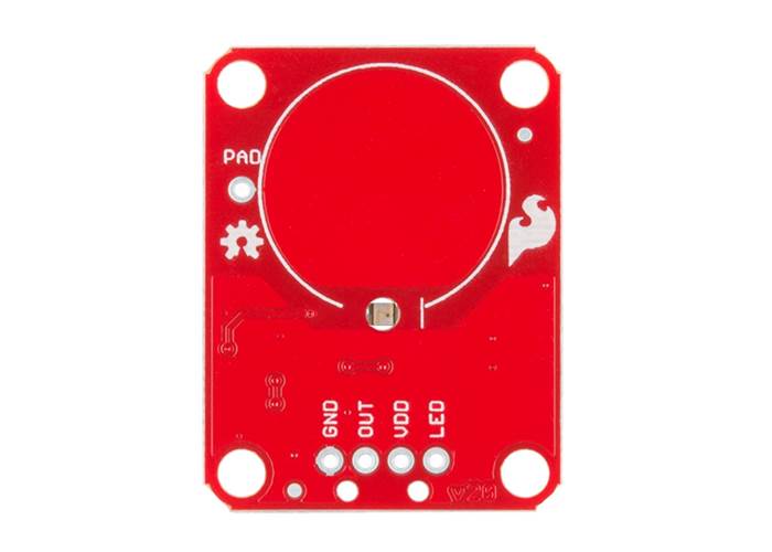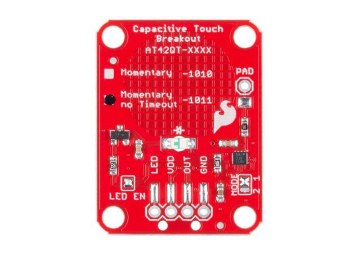 The AT42QT1010 is a dedicated, single-button capacitive sense chip. The chip handles monitoring a conductive area for touch. As long as a touch (e.g. from a finger) is detected, the AT42QT1010 keeps the output line high. Otherwise, the line is kept low. You just need to provide a power source (1.8V - 5V) and ground for the AT42QT1010 to work. Additionally, a PAD pin is available if you would like to create your own external electrode.