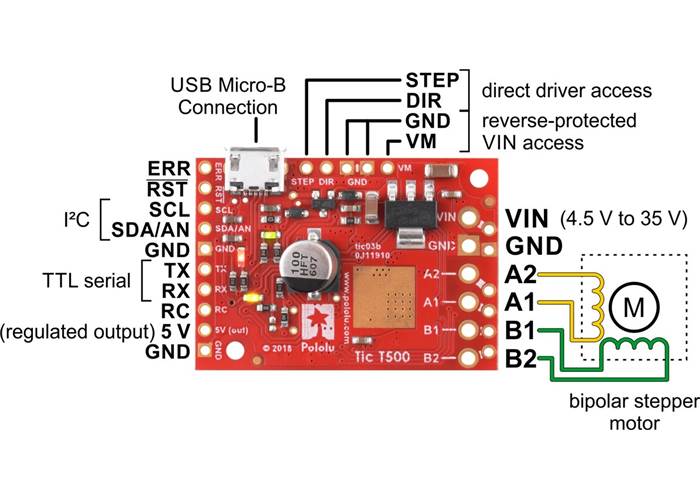 The Tic T500 USB Multi-Interface Stepper Motor Controller makes basic control of a stepper motor easy, with quick configuration over USB using our free software.