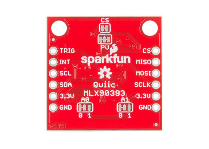 The MLX90393 features a resolution rate of 0.161µT with an operating voltage range of 2.2V to 3.6V at 100µA. This breakout is also equipped with a couple of jumper pads on the back of the board, a set that allows you to change the I2C address as well as one that can put the breakout into SPI mode (if I2C isn't your cup of tea).