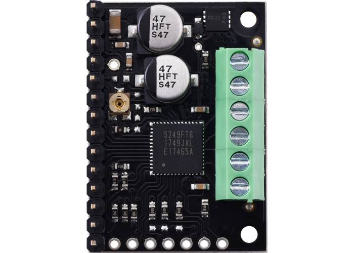 This product is a carrier board or breakout board for Toshiba’s TB67S2x9FTG family of stepper motor drivers; we therefore recommend careful reading of the corresponding driver’s datasheet before using this product. This stepper motor driver lets you control one bipolar stepper motor and is available in two different versions: the TB67S249FTG can deliver about 1.7 A per phase continuously (4.5 A peak), and the TB67S279FTG can deliver about 1.2 A per phase continuously (2 A peak). (See the Power Dissipation Considerations section below for more information.)