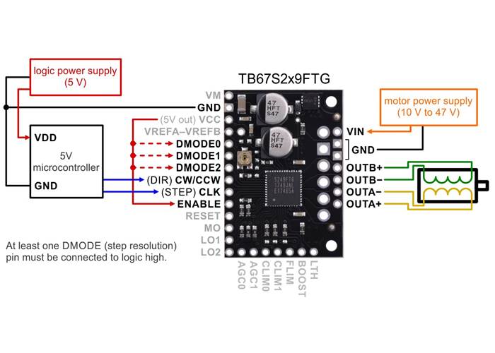 VCC Regulated 5 V output: this pin gives access to the voltage from the internal regulator of the TB67S2x9FTG. The regulator can only provide a few milliamps, so the VCC output should only be used for logic inputs on the board (such as the neighbouring DMODE pins), not for powering external devices.