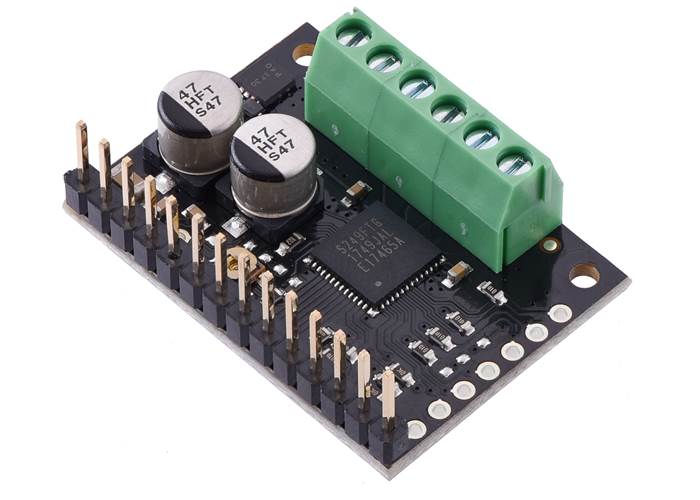 This product ships with all surface-mount components—including the TB67S2x9FTG driver IC—installed as shown in the product picture. However, soldering is required for assembly of the included through-hole parts: two 1×15-pin breakaway 0.1″ male headers and three 2-pin, 3.5 mm terminal blocks (for board power and motor outputs).