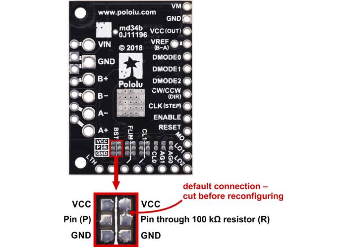 TB67S2x9FTG Stepper Motor Driver Carrier, Active Gain Control configurable logic input pin surface mount jumpers.