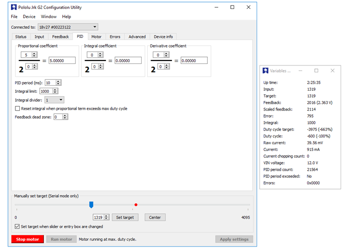 • PID coefficients can now be adjusted on the fly over the serial, I²C, and USB interfaces
