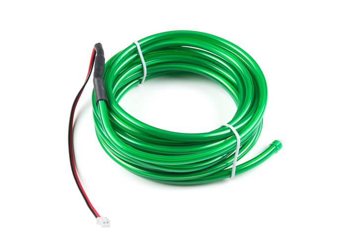 This particular wire glows with a green hue and is 3m (almost 10 feet) in length, approximately 5mm in diameter and is terminated with a simple JST-PH connector. This connector works directly with our SparkFun Original EL driver boards, the EL Escudo and the EL Sequencer.