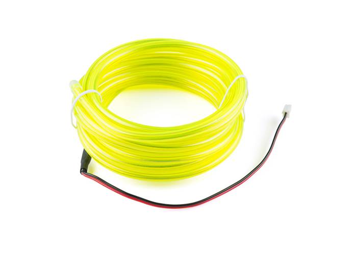 This particular wire glows with a fluorescent green hue and is 3m (almost 10 feet) in length, approximately 5mm in diameter and is terminated with a simple JST-PH connector. This connector works directly with our SparkFun Original EL driver boards, the EL Escudo and the EL Sequencer.