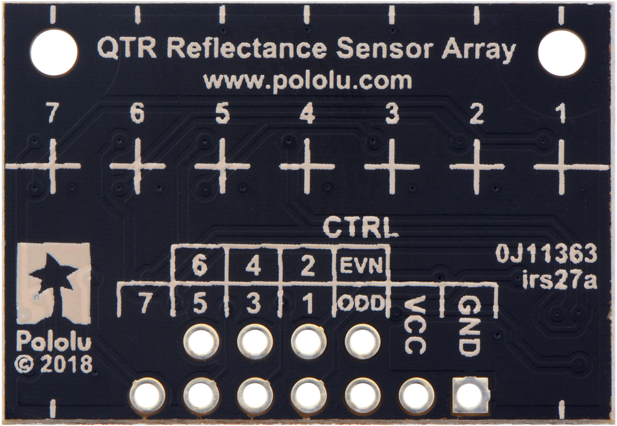 This array of IR LED/phototransistor pairs is great for precisely identifying changes in reflectance (like line detection). It operates from 2.9 V to 5.5 V and offers dimmable brightness control independent of the supply voltage and separate controls for the odd and even emitters. In general, the closer the object, the higher the contrast between light and dark readings, but high-reflectance objects are generally detectable out to around 40 mm. This version features the traditional-style QTR sensors without lenses.