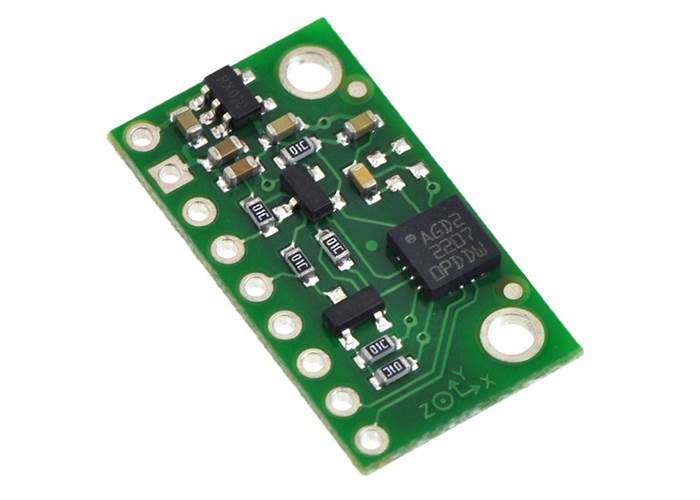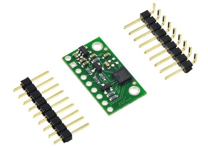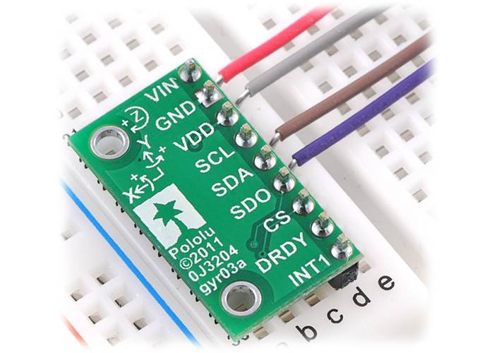 The carrier board includes a low-dropout linear voltage regulator that provides the 3.3 V required by the L3GD20, which allows the sensor to be powered from a 2.5-5.5 V supply. The regulator output is available on the VDD pin and can supply almost 150 mA to external devices. The breakout board also includes a circuit that shifts the I²C/SPI clock and data in lines to the same logic voltage level as the supplied VIN, making it simple to interface the board with 5 V systems, and the board’s 0.1″ pin spacing makes it easy to use with standard solderless breadboards and 0.1″ perfboards.