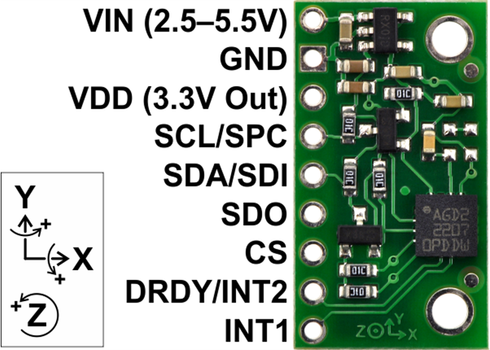 | VIN | This is the main 2.5-5.5 V power supply connection. The SCL/SPC and SDA/SDI level shifters pull the I²C and SPI bus high bits up to this level. |