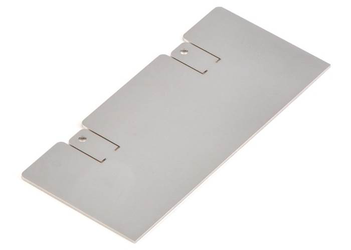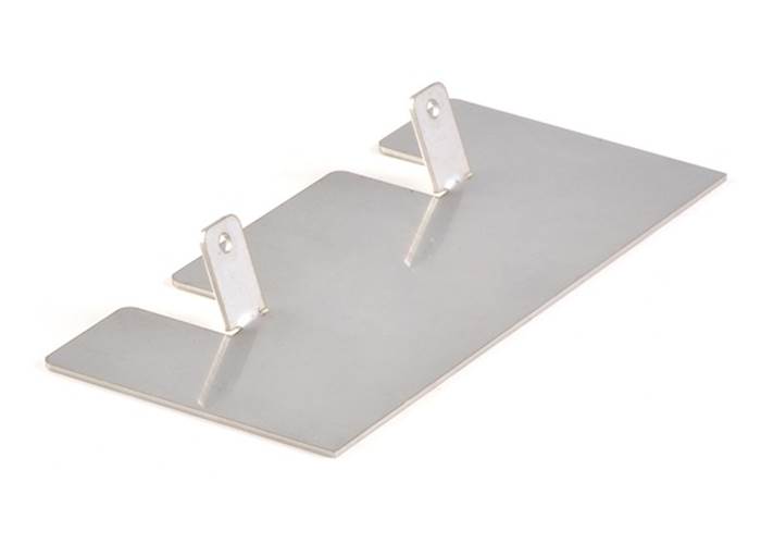 It is made of 0.036″-thick, laser-cut stainless steel, and it ships flat as shown in the product picture. The two tabs must be bent to an angle of approximately 70° before it can be mounted to the front of the Zumo chassis. We recommend using a pair of long-nose pliers to bend the tabs: