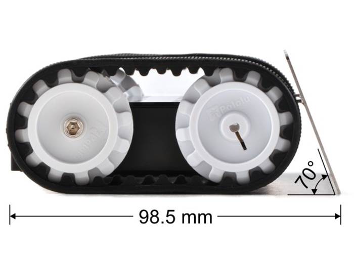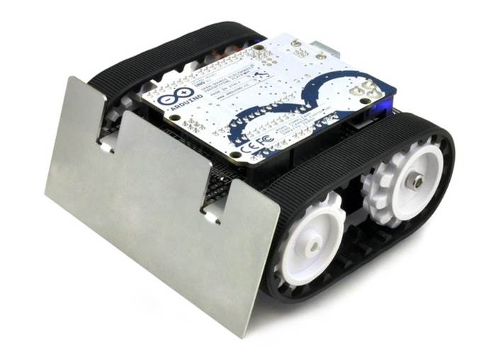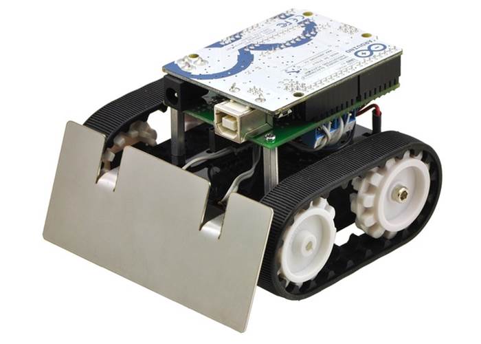 This 0.036″-thick stainless steel plate can be mounted to the front of the Zumo chassis to create a slanted, bulldozer-like blade for pushing around objects, such as other mini-sumo robots.
