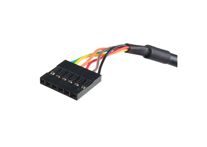 The FTDI cable is designed around an RS232, which is housed in a USB C connector. The other side of the cable is terminated with a 0.1" pitch, 6-pin connector with the following pinout: RTS (Green), RX (Yellow), TX (Orange), VCC 5V (Red), CTS (Brown), GND (Black). This FTDI to USB C Cable is also capable of handling high voltages up to 300V max.