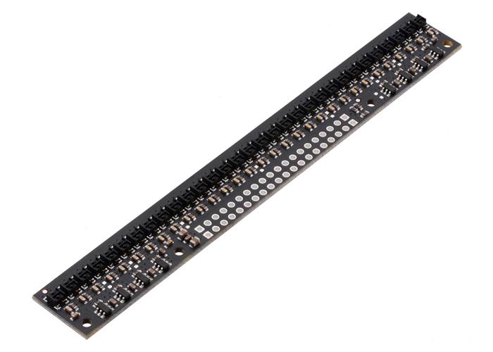 These reflectance sensors feature a linear array of infrared emitter/phototransistor pair modules in a high-density (4 mm pitch) or medium-density (8 mm pitch) arrangement, which makes them well suited for applications that require detection of changes in reflectivity. This change in reflectivity can be due to a colour change at a fixed distance, such as when sensing a black line on a white background, as well as due to a change in the distance to or presence of an object in front of the sensor. A variety of sensor counts and densities is available so you can pick the ideal arrangement for your application. Since the outputs are all independent, you can connect just some of the channels to attain an irregular or non-standard sensor spacing.