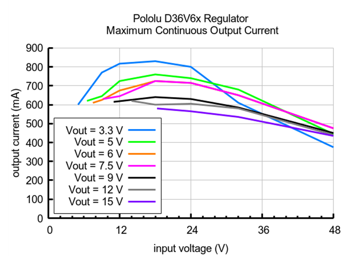 The dropout voltage of a step-down regulator is the minimum amount by which the input voltage must exceed the regulator’s target output voltage in order to ensure the target output can be achieved. For example, if a 5 V regulator has a 1 V dropout voltage, the input must be at least 6 V to ensure the output is the full 5 V. Generally speaking, the dropout voltage increases as the output current increases. The graph below shows the dropout voltages for the different members of this regulator family: