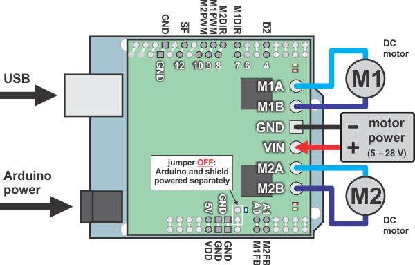 • When used as a shield, the motor power supply can optionally be used to power the Arduino base as well