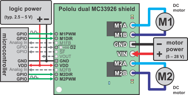 Using the dual MC33926 motor driver shield with a microcontroller (grey connections are optional).