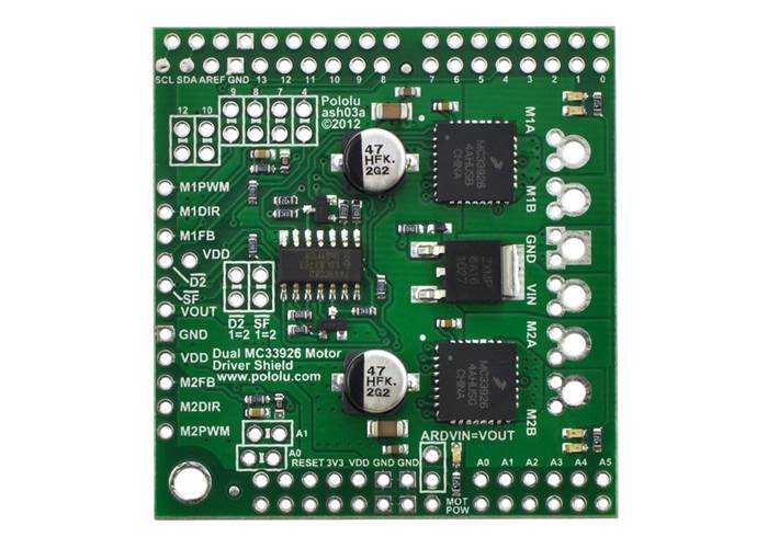 This shield makes it easy to control two brushed DC motors with your Arduino or Arduino-compatible board. Its dual MC33926 motor drivers operate from 5 to 28 V and can deliver a continuous 3 A per motor. These great drivers also offer current-sense feedback and accept ultrasonic PWM frequencies for quieter operation. The Arduino pin mappings can all be customized if the defaults are not convenient, and the motor driver control lines are broken out along the left side of the shield for general-purpose use without an Arduino.