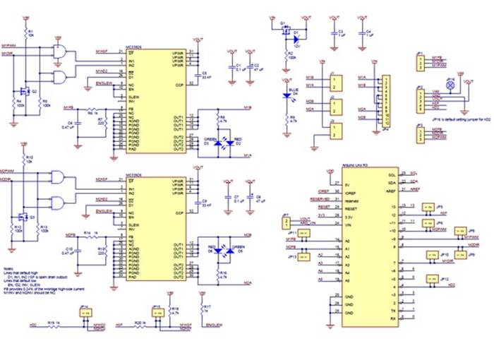 PDF of schematic: dual MC33926 motor driver shield schematic (350k pdf).
