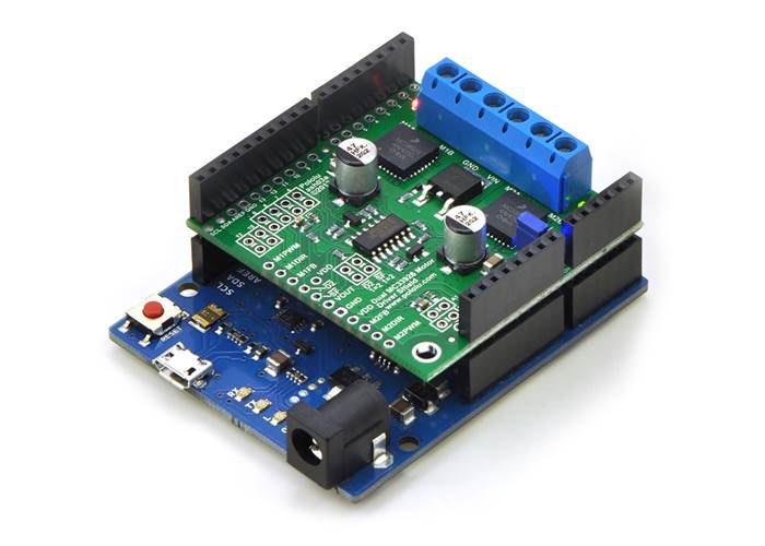 For a higher-power alternative to this shield, please consider the dual VNH5019 motor driver shield, which can deliver a continuous 12 A per channel. For lower-power, lower-cost alternatives, consider the dual MAX14870 motor driver shield, DRV8835 dual motor driver shield, or A4990 dual motor driver shield.