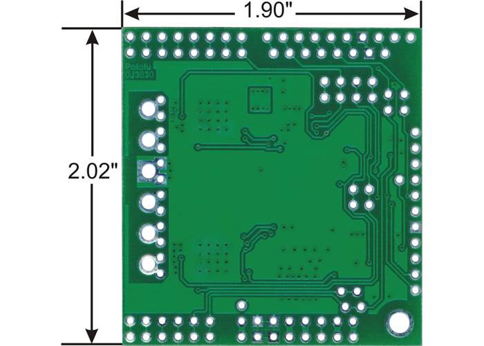 Pololu dual MC33926 motor driver shield for Arduino, bottom view with board dimensions.