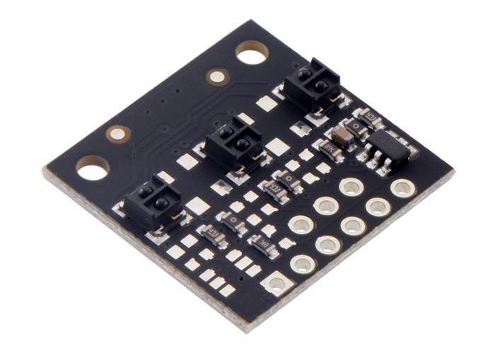 This array of IR LED/phototransistor pairs is great for precisely identifying changes in reflectance (like line detection). It operates from 2.9 V to 5.5 V and offers dimmable brightness control independent of the supply voltage. In general, the closer the object, the higher the contrast between light and dark readings, but high-reflectance objects are generally detectable out to around 30 mm. This version features high-performance, low-current QTRX sensors with lenses.