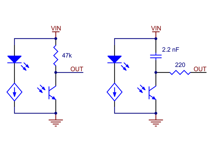 Schematic diagrams of individual QTR sensor channels for A version (left) and RC version (right). This applies only to the newer QTRs with dimmable emitters.
