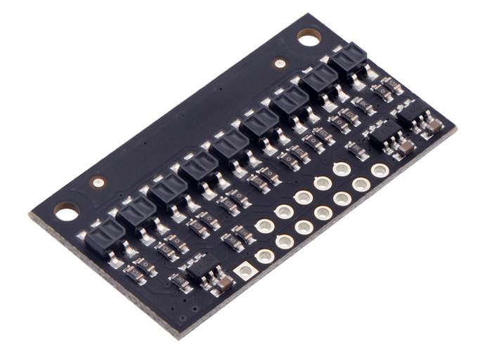 This array of IR LED/phototransistor pairs is great for precisely identifying changes in reflectance (like line detection). It operates from 2.9 V to 5.5 V and offers dimmable brightness control independent of the supply voltage and separate controls for the odd and even emitters. In general, the closer the object, the higher the contrast between light and dark readings, but high-reflectance objects are generally detectable out to around 40 mm. This version features the traditional-style QTR sensors without lenses.
