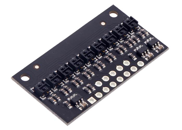 These reflectance sensors feature a linear array of infrared emitter/phototransistor pair modules in a high-density (4 mm pitch) or medium-density (8 mm pitch) arrangement, which makes them well suited for applications that require detection of changes in reflectivity. This change in reflectivity can be due to a colour change at a fixed distance, such as when sensing a black line on a white background, as well as due to a change in the distance to or presence of an object in front of the sensor. A variety of sensor counts and densities is available so you can pick the ideal arrangement for your application. Since the outputs are all independent, you can connect just some of the channels to attain an irregular or non-standard sensor spacing.