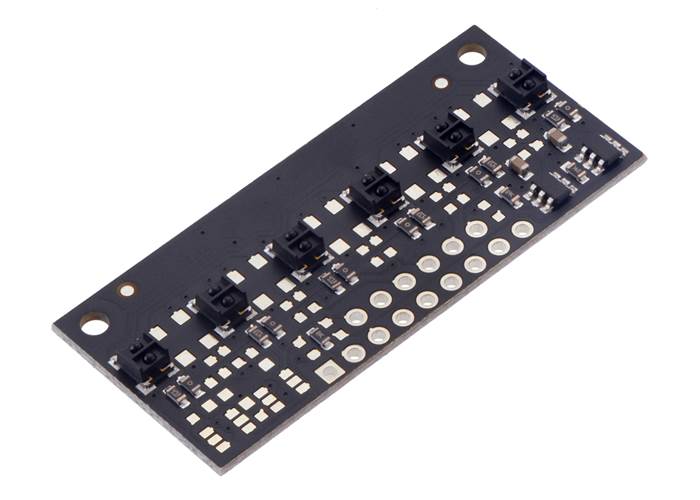 This array of IR LED/phototransistor pairs is great for precisely identifying changes in reflectance (like line detection). It operates from 2.9 V to 5.5 V and offers dimmable brightness control independent of the supply voltage. In general, the closer the object, the higher the contrast between light and dark readings, but high-reflectance objects are generally detectable out to around 40 mm. This version features high-performance, low-current QTRX sensors with lenses.