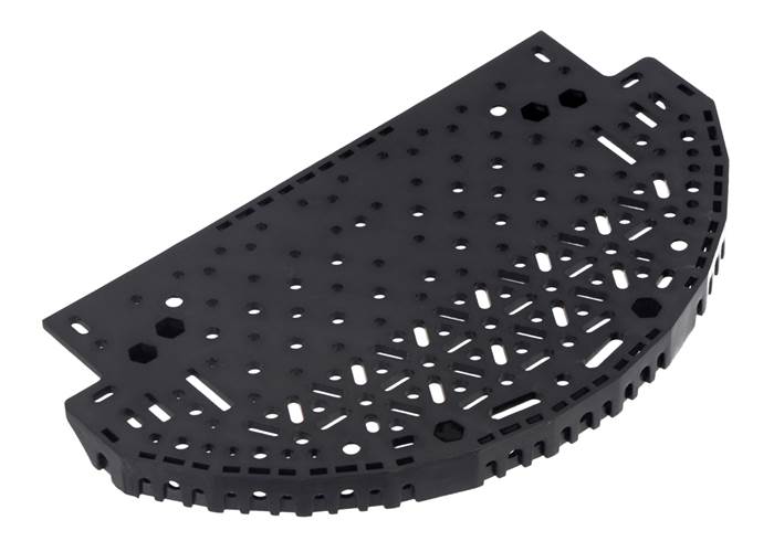 This Romi Chassis accessory offers a convenient way to expand your Romi robot vertically by adding new tiers. The expansion plate has the same diameter as the base plate, but we made it only a half circle to give you more expansion options. For example, when used as part of the Romi robot arm kit, it supports the arm in the back while leaving the front half of the Romi open. For a full-sized expansion platform, just combine two expansion plates. A mixture of mounting holes and slots give you the flexibility to mount components in a variety of orientations almost anywhere on the plate.