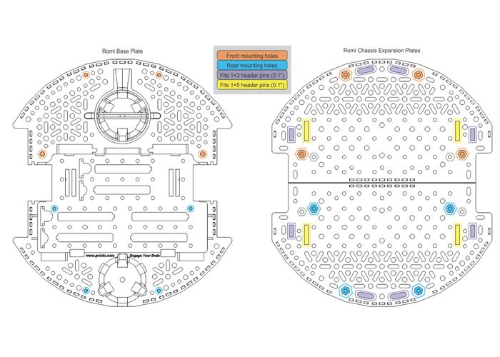 The expansion plate is a half circle with the same diameter as the base plate, and it can be installed over either the front or rear half of the Romi chassis using appropriately sized standoffs (see below for more information):