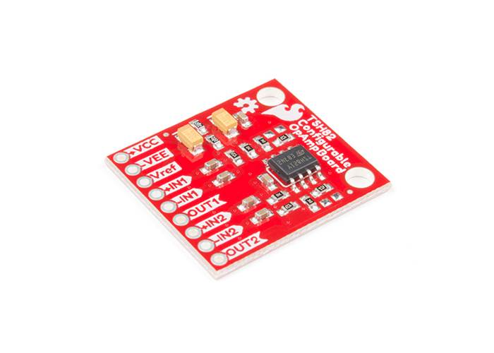 The SparkFun TSH82 Configurable OpAmp Board was designed to give you the best combination of performance and flexibility that we could achieve by giving you two gain stages, each one independently accessible on the header pins. Each stage is natively configured as an inverting amplifier that can also be strung together to expand the capabilities of the TSH82 from STMicroelectronics. With the use of the jumpers on the back of the board, you can configure each stage for non-inverting operation, differential input, and DC input coupling.