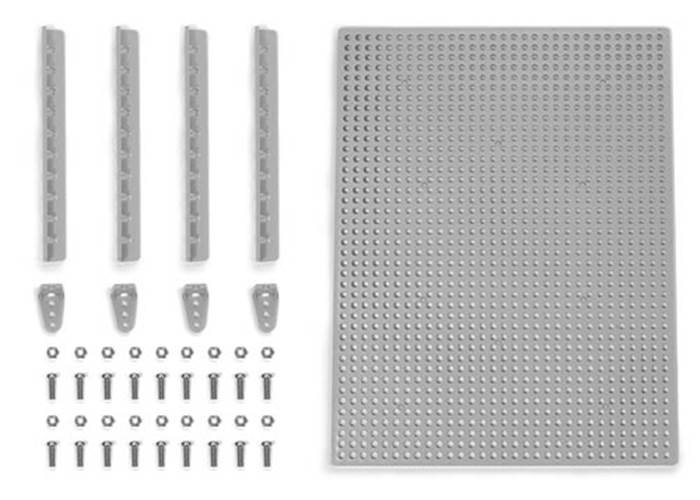 This set includes a plastic plate with an 41 x 31 grid of 3 mm holes spaced 5 mm apart, which provides space for many mechanical connections. The four included eleven-hole angle brackets can connect additional Universal Plates or can serve as a mounting point for an axle. The plate set also includes four shaft mounts (the triangular brackets in the above picture) for supporting axles at one of three heights from the plate. The kit provides eighteen screws and eighteen nuts for connecting the angle brackets and shaft mounts to the plate.
