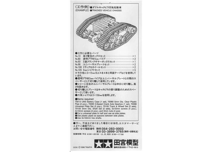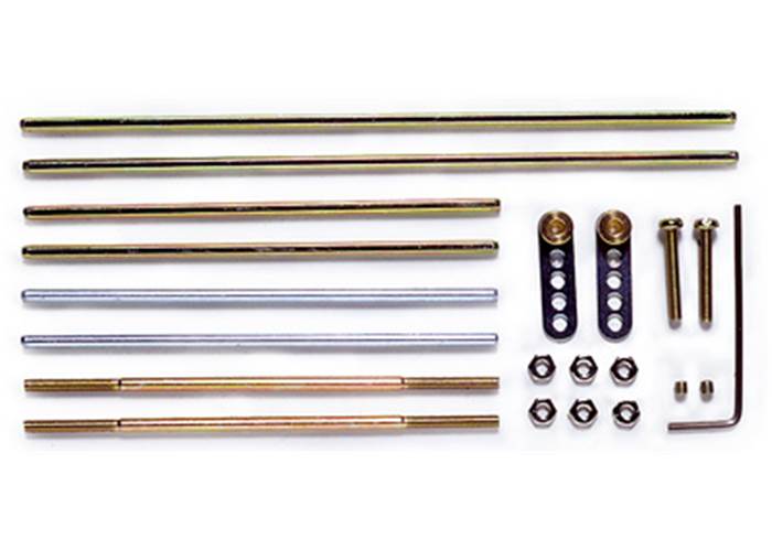 The Tamiya 3 mm Diameter Shaft Set includes two 150 mm and two 100 mm hexagonal shafts, which are compatible with Tamiya gearboxes with 3 mm hexagonal shafts and Tamiya wheels. Four 3 x 100 mm round shafts are included, two of which have 20 mm of threads on their ends for mounting pulleys. The set contains two adjustable crank arms with set screws and a hex wrench for tightening the set screws. Two 3 x 20 mm screws for mounting the crank arms and six nuts for securing pulleys are also included.