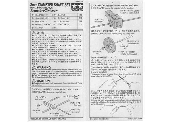 The Tamiya 70105 3mm Diameter Shaft Set provides an assortment of hexagonal and round shafts for mounting wheels and pulleys to your robot. The 3 mm diameter of the shafts makes them compatible with the Tamiya gearboxes with 3 mm hexagonal shafts and with other Tamiya products .