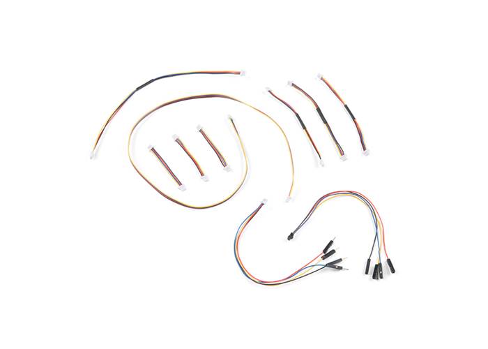 The SparkFun Qwiic Cable Kit includes 10 cables of various lengths and styles that will get your Qwiic boards connected together, to a development platform, or to a breadboard. Each Qwiic Cable's wires have been colour coded to red, black, blue and yellow with 1mm JST termination.