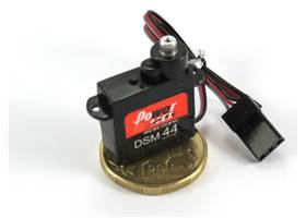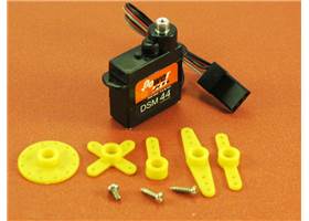 The DSM44 digital servo from Power HD is a micro servo with digital control electronics for enhanced performance and metal gears for increased durability. It is a great tiny actuator for robotic or RC mechanisms that need to be light, quick, and strong. Servo horns and associated hardware are included. Key specs at 6 V: 0.07 sec/60°, 22 oz-in (1.6 kg-cm), 6 g.
