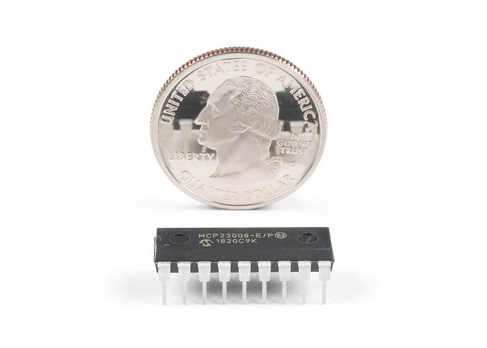 You can set the I2C address by tying the ADDR0-2 pins to power or ground, for up to eight unique addresses. That means eight chips can share a single I2C bus - that’s 64 I/O pins!