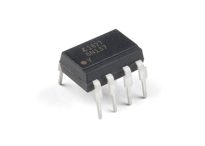 This diode-transistor photocouplers consist of an LED, optically coupled to a high speed photodetector to transmit electrical signals between circuits while still isolating your system from higher voltages. The 6N137 optoisolator is presented in an 8-pin DIP package.