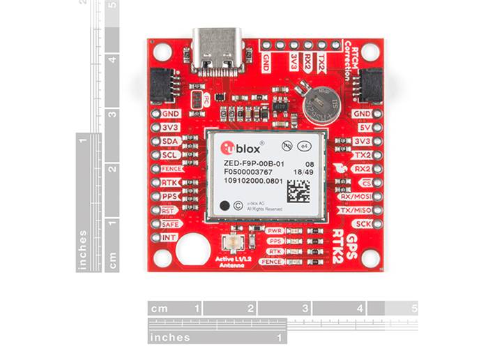This board is built around the u-blox ZED-F9P module, a top-of-the-line receiver for high-accuracy GNSS and GPS location solutions. This module is capable of an incredible 10mm three-dimensional accuracy. With this board, you will be able to know where your (or any object's) X, Y, and Z location is within roughly the width of your fingernail.