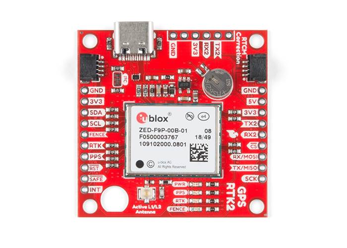The GPS-RTK2 is a communication powerhouse. It features five simultaneous communication ports, all active at the same time: USB-C (which enumerates as a COM port), UART1 (3.3V TTL), UART2 (for RTCM reception, 3.3V TTL), I2C (via the two Qwiic connectors or pins), and SPI.