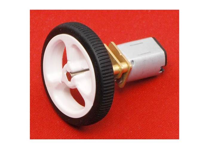 Black Pololu Wheel 70×8mm on a Pololu Micro Metal Gearmotor.