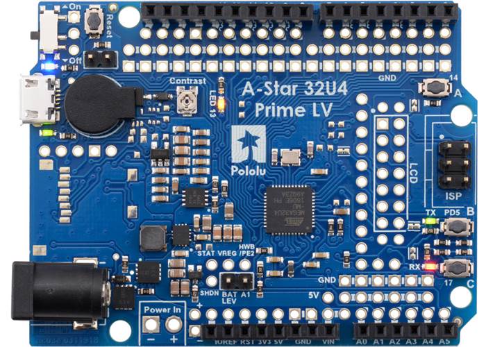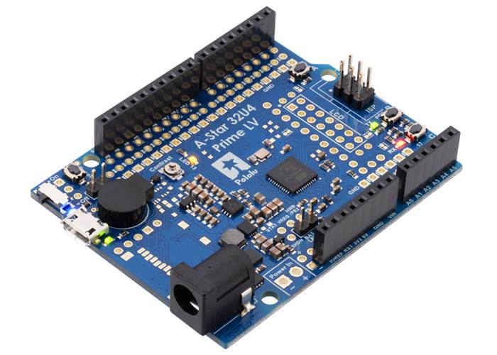 The A-Star 32U4 Prime LV is a programmable board based on the ATmega32U4 AVR microcontroller and arranged in the common Arduino form factor.