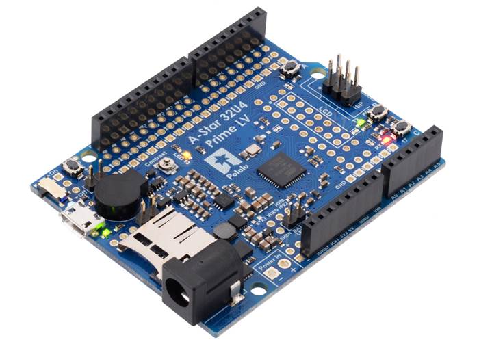 The A-Star 32U4 Prime LV is a programmable board based on the ATmega32U4 AVR microcontroller and arranged in the common Arduino form factor. The A-Star Prime offers many additional features and improvements over competing products, including superior power management that enables efficient operation from 2 V to 16 V (though it requires at least 3 V at start-up). This configuration of the A-Star 32U4 Prime LV includes microSD support and preinstalled female headers common to many Arduinos.