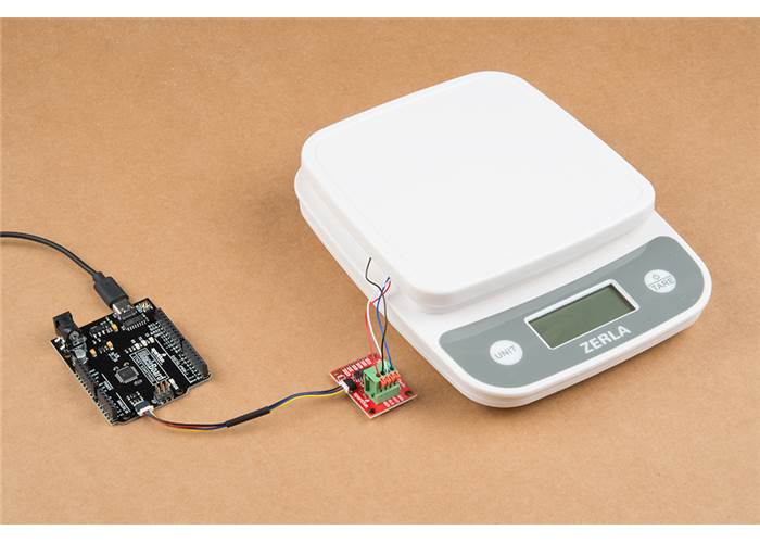 By connecting a load cell to the Qwiic Scale you will be able to translate sensor data into something your microcontroller can read. The NAU7802 is an ADC with built in gain and I2C output to amplify and convert the readings from a standard load cell. A load cell is basically a device that translates pressure or force into electrical signals. In most cases this signal is very small and needs to be amplified. There are many popular chips that read the change and amplify it, but the NAU7802 goes one step further and converts everything to a true I2C output (attached to a Qwiic connector).