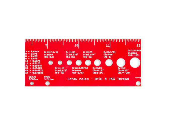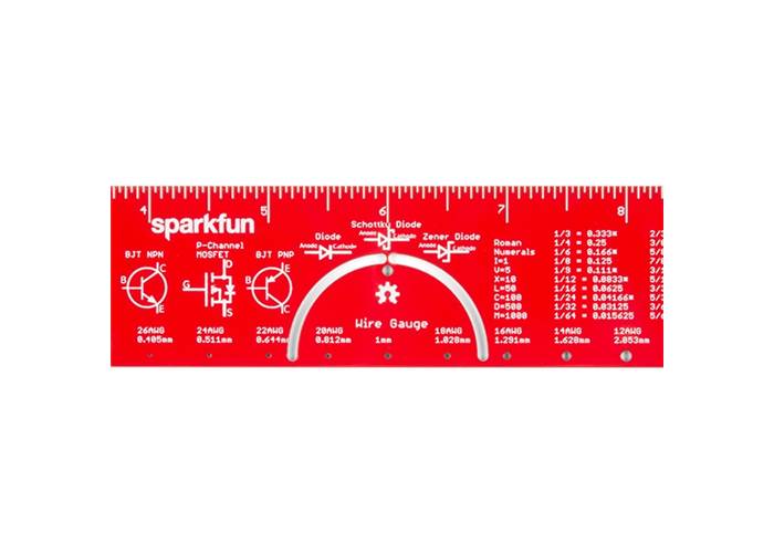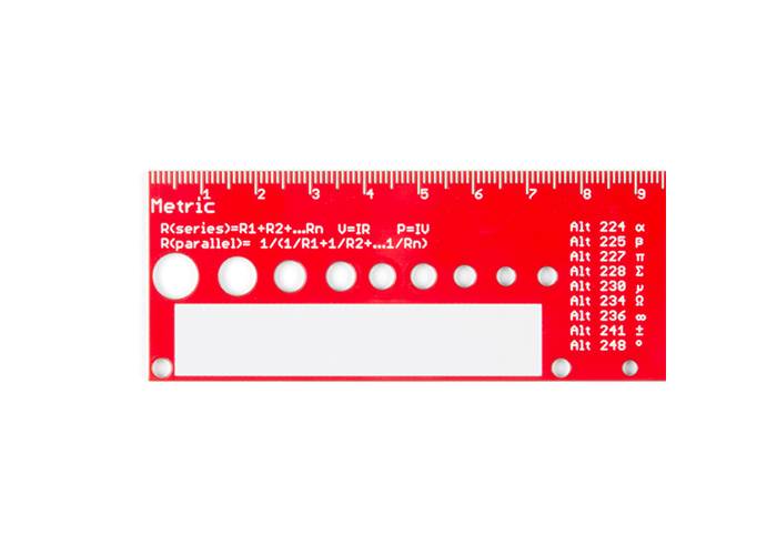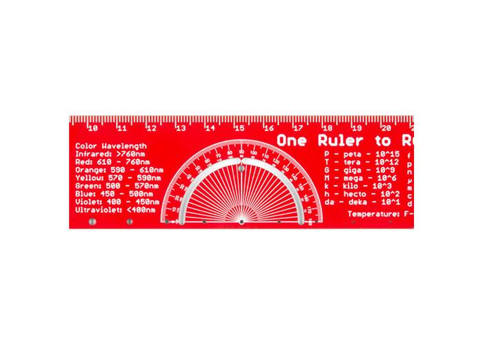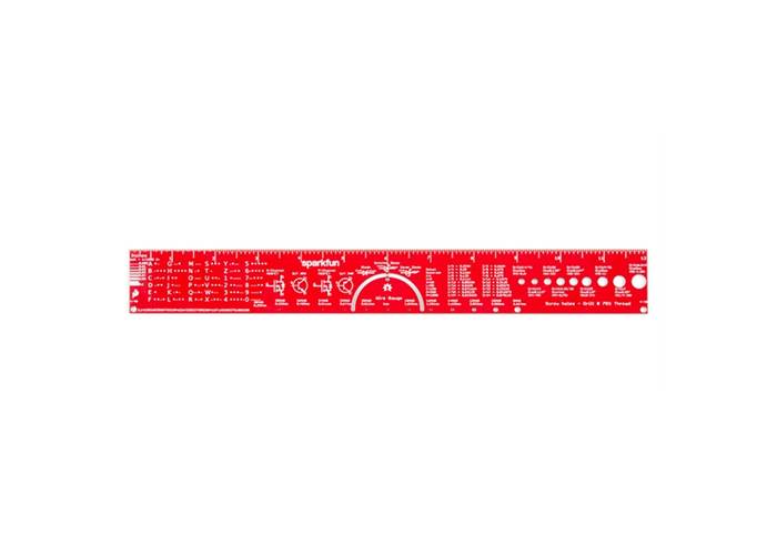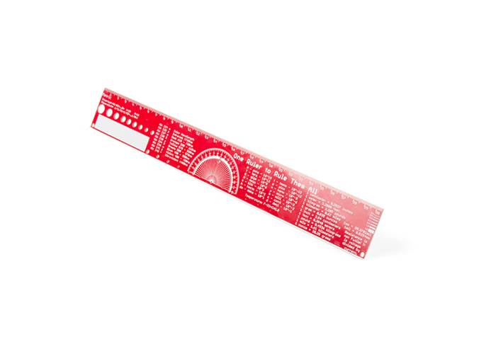 One ruler to rule them all. This is a basic 12 inch ruler, but made from a PCB. We have included a lots of useful information on each side of the ruler that you might use on a daily basis including Wire Gauge holes, transistor diagrams, common fractions, Roman numerals, and metric to imperial conversions. Most importantly, the ruler provides you with a straight line and centimetre markings one side and inch markings on the other side.