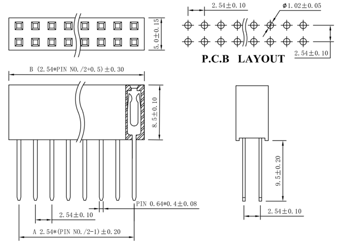 Dimensions (in mm) of the Stackable 0.100″ Female Header for TI-RSLK MAX: 2×19-Pin, Straight. |