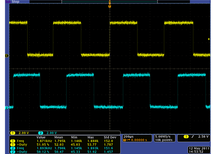 By counting both the rising and falling edges of both the A and B outputs, it is possible to get 48 counts per revolution of the motor shaft. Using just a single edge of one channel results in 12 counts per revolution of the motor shaft, so the frequency of the A output in the above oscilloscope capture is 12 times the motor rotation frequency.