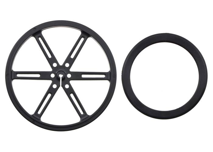 This pair of tires can be used as replacements for the ones included with our 80×10mm and 90×10mm Pololu wheels, and they can also be used as tires for other similarly sized wheels. The tires are made of 2.5mm-thick silicone and feature horizontal treads for improved traction. They have a width of 10 mm and an unstretched outer diameter of 66 mm, and they can comfortably stretch to fit wheels up to 90 mm in diameter.