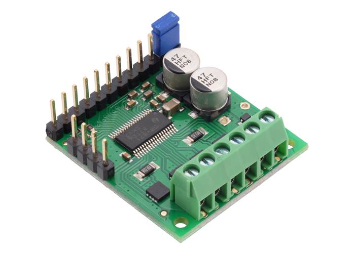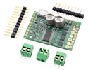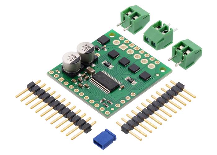 The 0.1″ male headers can be broken or cut into smaller pieces as desired and soldered into the smaller through-holes. These headers are compatible with solderless breadboards, 0.1″ female connectors, and our premium and pre-crimped jumper wires. The terminal blocks can be soldered into the larger holes to allow for convenient temporary connections of unterminated power and motor wires (see our short video on terminal block installation). You can also solder your motor leads and other connections directly to the board for the most compact installation.